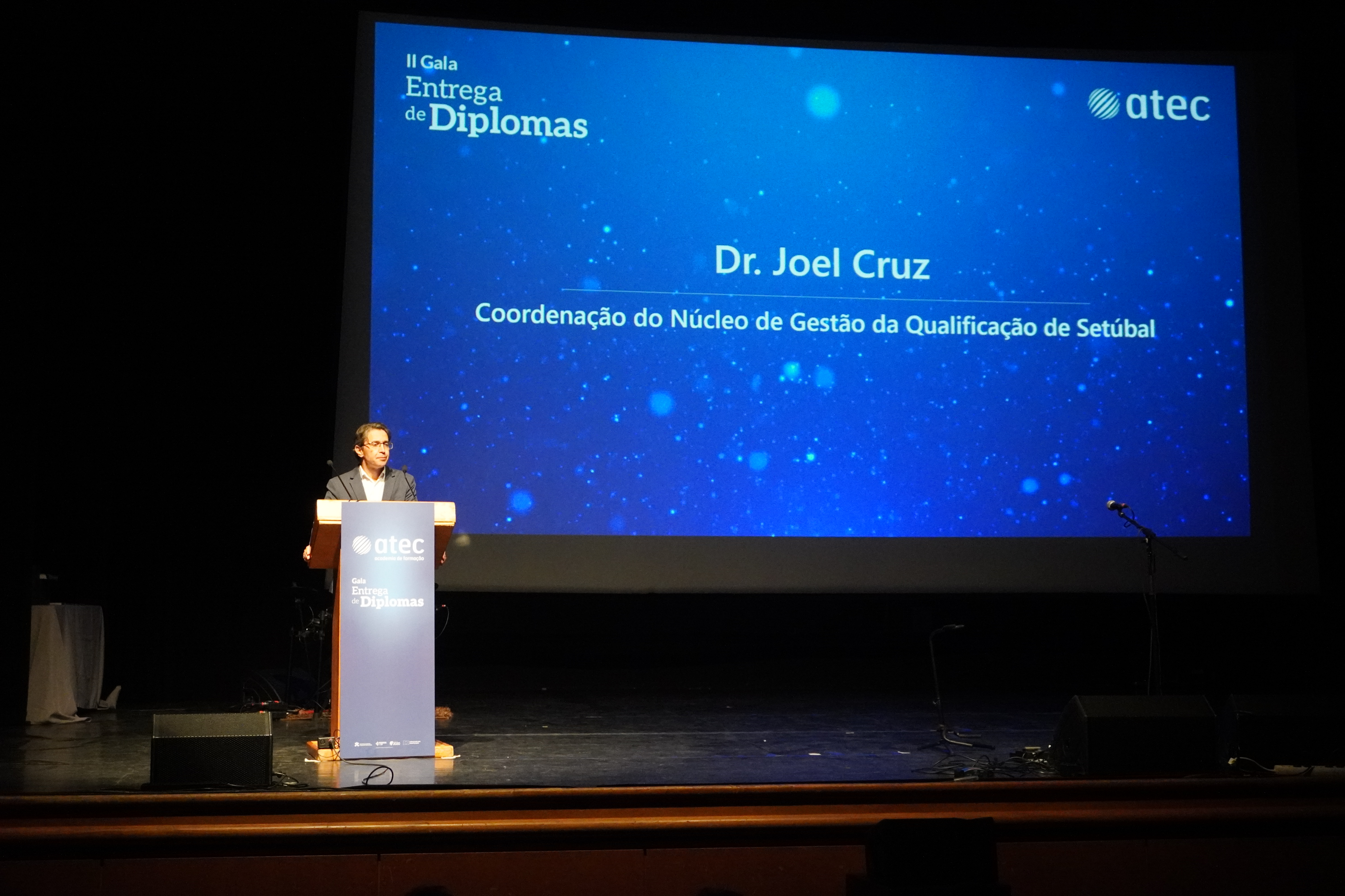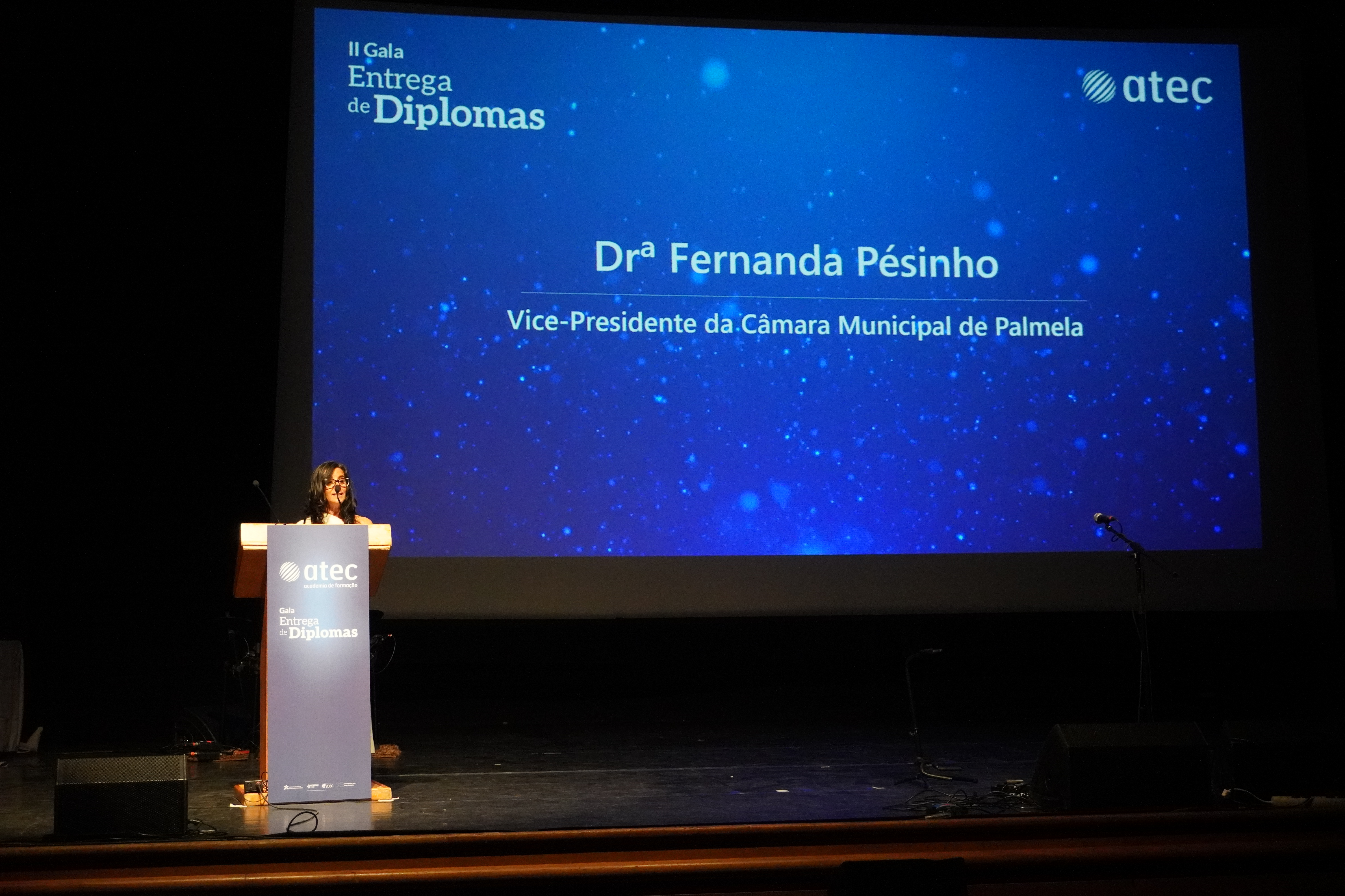 Os discursos da Dr.ª Fernanda Pésinho, Vice-presidente da Câmara Municipal de Palmela, e do Dr. Joel Cruz, Coordenador do Núcleo de Gestão da Qualificação de Setúbal do Instituto do Emprego e Formação Profissional, deram o mote para uma noite em que as estrelas foram os diplomados.